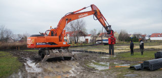 Austrian company Böhm Transport is in charge of conducting the piling work at a new building area located in Neusiedel am See, Austria. Sheet pile walls built to the site will support the housing area and protect it from the water which runs on a channel made around the buildings. This artificial channel can later be used by the house owners and their boats as a direct way to the nearby lake. Piling will also take place when conducting a pier construction which includes a steel frame welded to the pile wall. This frame is then covered by a wooden pier deck. The piles are driven by Movax SP30 on Daewoo 210 wheel excavator. Piles used in building were PU18 with 4 and 5 meters in length and 800 mm in width.