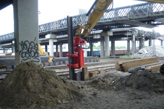 After the demolition works of the old bridge the bases for the new bridge pillars have to be excavated. Each base is a rectangle with the size of 16 x 8 meters. Before starting the excavation process the construction site had to be supported with a sheet pile wall. The sheet piles used were GU 16-400 up to 12 meters in length. For this work company Chrobok decided to use a combination of their brand-new Movax SP60F attached to Caterpillar 325D excavator and a crane mounted vibrator. One of the big benefits of the Movax on this site is the fact that a big part of the work is conducted in a low space under and by the still standing old bridge construction.