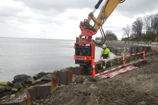 NCC Hercules Grundläggning is conducting the sheet piling work around this project along the coastal road Strandvejen at the east of Copenhagen. To protect the water pipe trench from incoming seawater near the sea, special 9-12 meter long sealed sheet piles need to be installed before digging the trench. NCC Hercules utilizes brand new Movax SG-75TR on CAT330D Carrier among other piling machinery for this work. CAT carrier is fitted with Movax CS Pro control system to allow automatic controlled vertical pile driving.