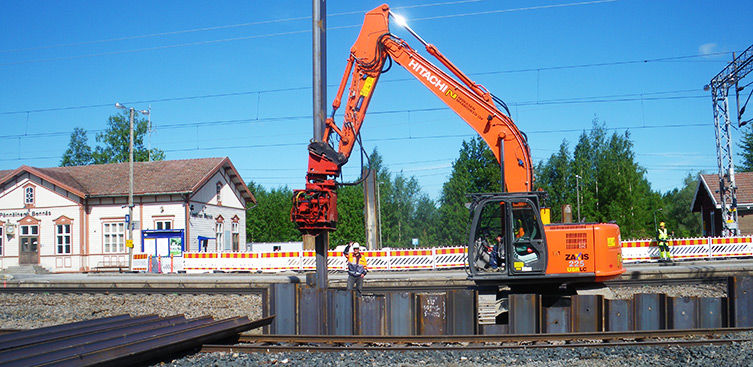 Sheet pile retaining walls were installed to form basis to the underpass at Pännäinen railway station near Pietarsaari in Finland. 10 meter long sheet piles were partly for temporary excavation support but for some sections the sheets formed the permanent structure of the under rail passageway that allows passengers access to platforms. Piling contractor Niskasen Maansiirto Oy was driving the sheets with Movax SP-50E Side-Grip vibro mounted to Hitachi crawler excavator.